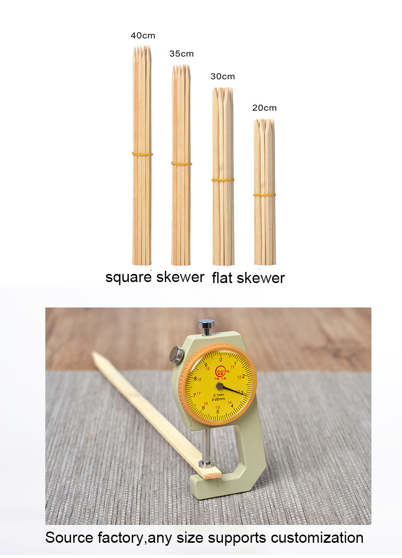 Nous utilisons ces brochettes plates en bambou en gros, vendues par lot de 25 pièces dans un sac. Elles sont disponibles en différentes tailles (longues, moyennes et petites). Nous pouvons également y apposer notre logo.